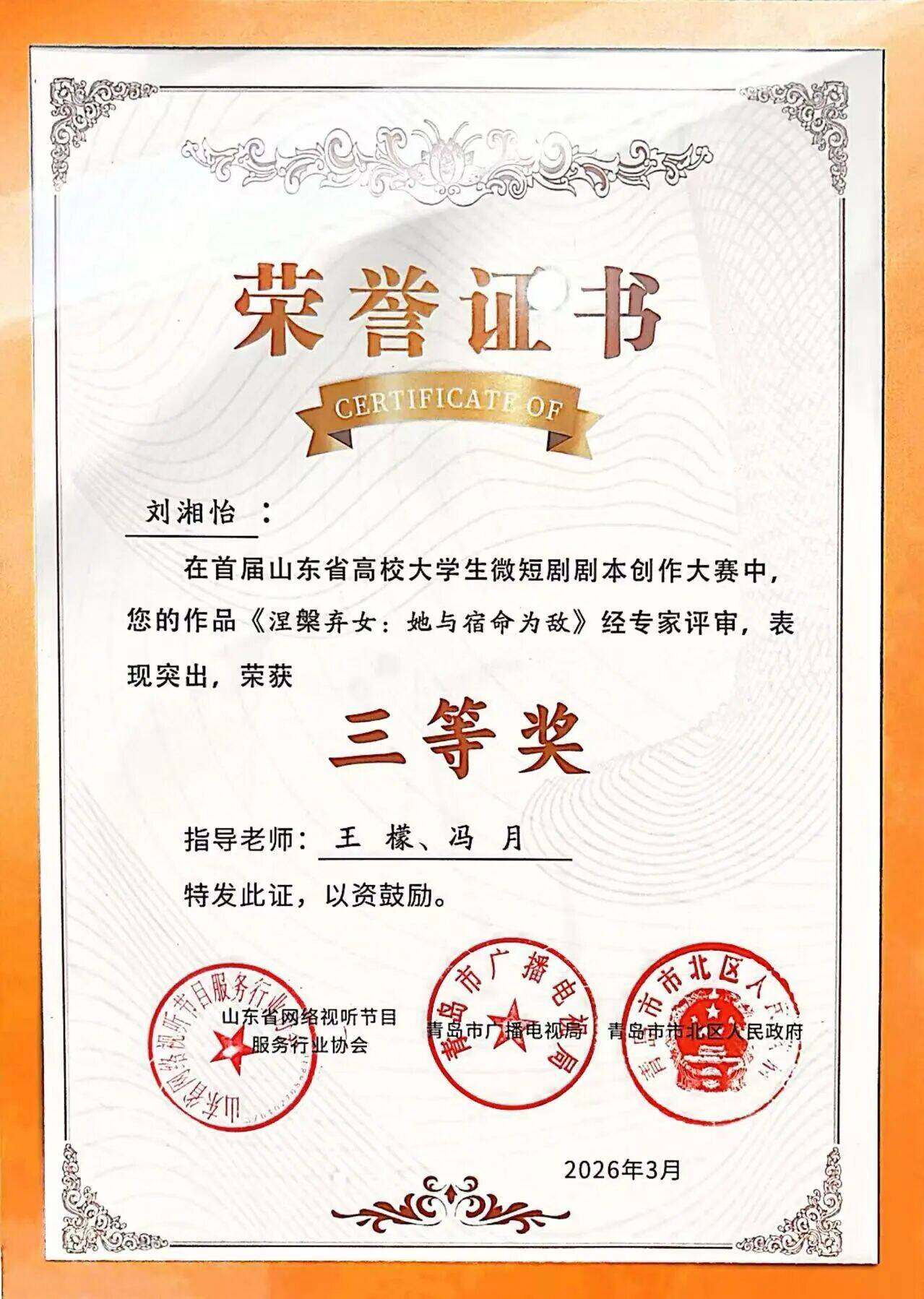 近日,由山东省广播电视局指导,山东省网络视听节目服务行业协会等单位联合主办的首届山东省高校大学生微短剧剧本创作大赛圆满落幕。我系学子刘湘怡同学凭借立意深刻、叙事成熟的原创剧本脱颖而出,荣获大赛三等奖,成为本届大赛唯一获奖的高职院校学生,充分展现了我系智能视听创意与制作专业群扎实的育人成效。